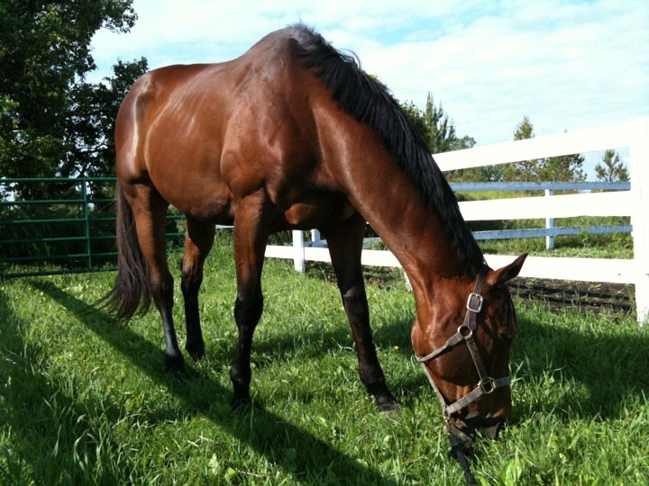 Because he had the winter off, Derby isn’t terribly fit. He’s in good condition – sleek and shiny – but needs to develop more strength, flexibility and endurance (as does his rider, frankly.) Right now, rides are short – I’m doing 10-15 minutes of warm up at the walk, working on his suppleness during that period. While we walk, I ask him to follow a direct rein, which he does nicely, turning his head quietly when I ask. I also move him around from my seat, using one seatbone, and then the other, to move in a shallow serpentine. He’s good at this and very responsive, which bodes well for us! Finally we do some shoulder in.