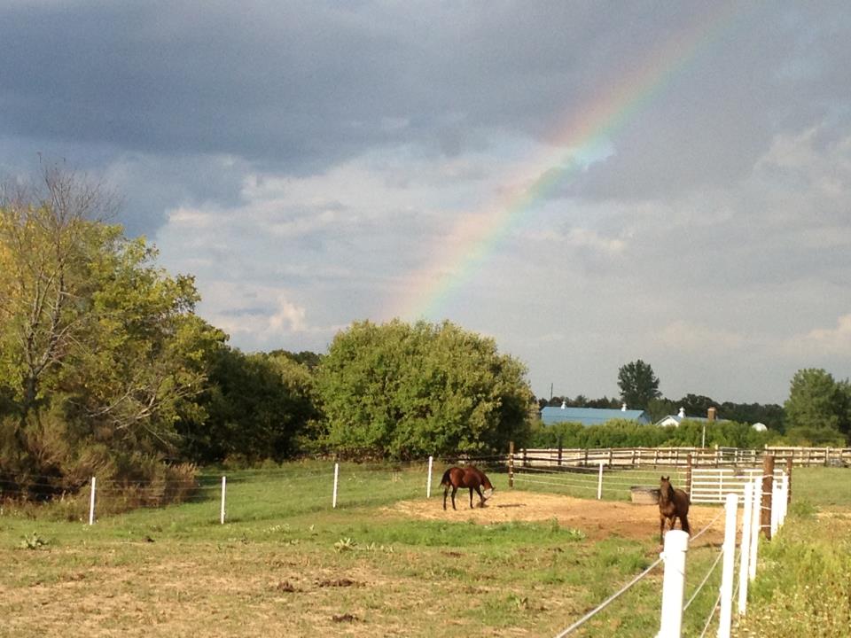 While I was up there, a rain shower passed over the area, leaving an unbelievably vivid rainbow. While my camera phone picture left a but to be desired, you can get the gist. And needless to say, this rainbow was terminating in a Golden Delicious apple tree. So, no pot of leprechaun gold, but I think the horses would take the apples any day.