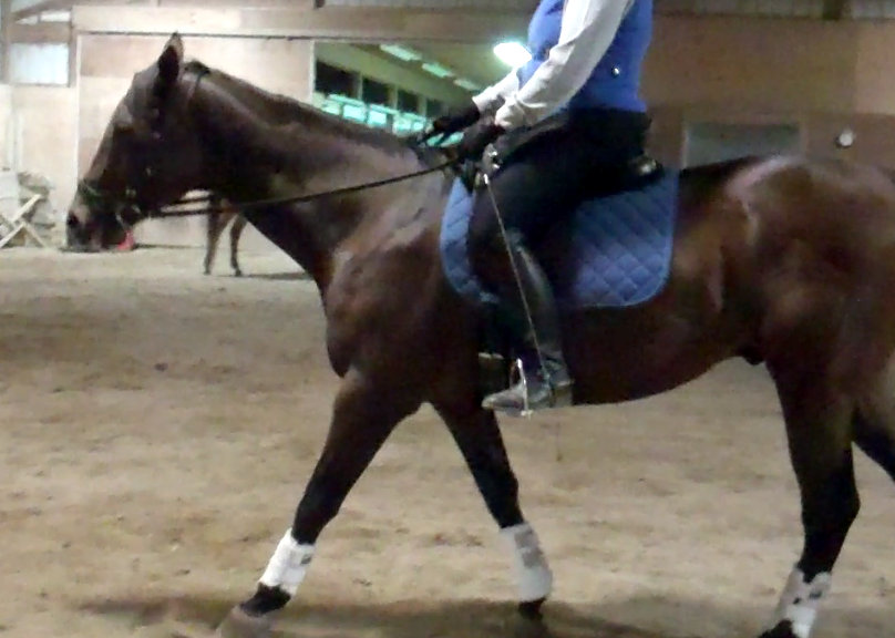 I was posting out of a half-seat, to stay off his back, and I increased my post, to make more “room” for a bigger stride. I also got busy with my inside leg, engaging my core and making a point of holding my outside rein and asking Frank to soften with the inside rein. Within a few strides, I got results. Frank took the contact, stretched, and the trot started to feel a lot better. I tested my contact by seeing if Frank would follow my contact downward – if he didn’t, that would tell me that he was just going around with a fake headset. I invited a stretch, and got it. I had true contact. Yay! I could feel myself holding him between the inside leg and my outside rein. It’s been a looong time since I felt that!