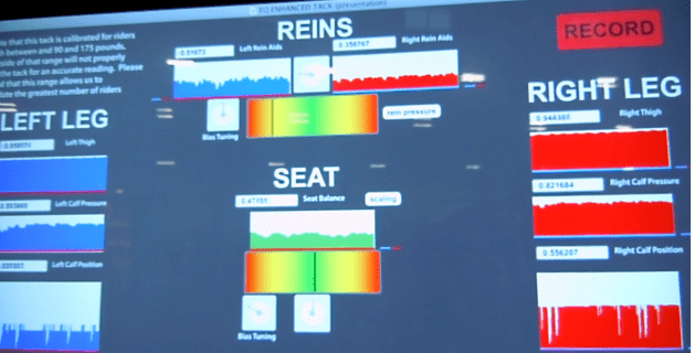 This weekend I had the opportunity to have my riding position analyzed using an Equicizer from Equisense systems. The Equicizer is endorsed byformer Olympian and general dressage goddess Jane Savoie, and is a sensor-loaded dummy horse that, when mounted, reveals how even (or not!) a rider’s position is. Everything from leg pressure to seat position to the weight one takes in the reins is measured and fed back to the rider.