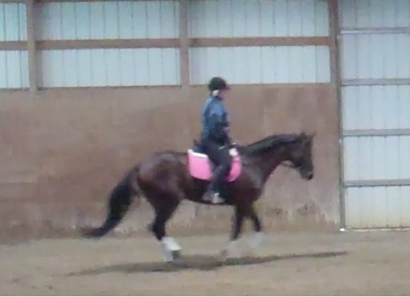 I took my nice bending and started to work on transitions, shifting from walk to trot to walk again, asking for a prompt response from the mare, while also keeping her round. As we worked, I found I found I had a nicely forward horse and so I asked for the canter, and got a a decent upward transition.