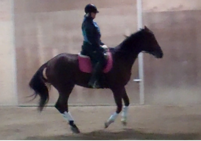 We made some progress tonight, getting what we call “big trot” which really just means a decent working trot, with the horse tracking up and a nice rhythmic tempo. It feels good to be riding that trot again, though I’m still not getting the gait in which I can really feel the mare pushing with the big engine in her hindquarters. But we aren’t too far away from it. And I need to make that nice “big” trot my habit. That’s the trot that ultimately is easiest to work from – which is precisely why it’s called “working trot.” It’s an essential piece of the foundation.