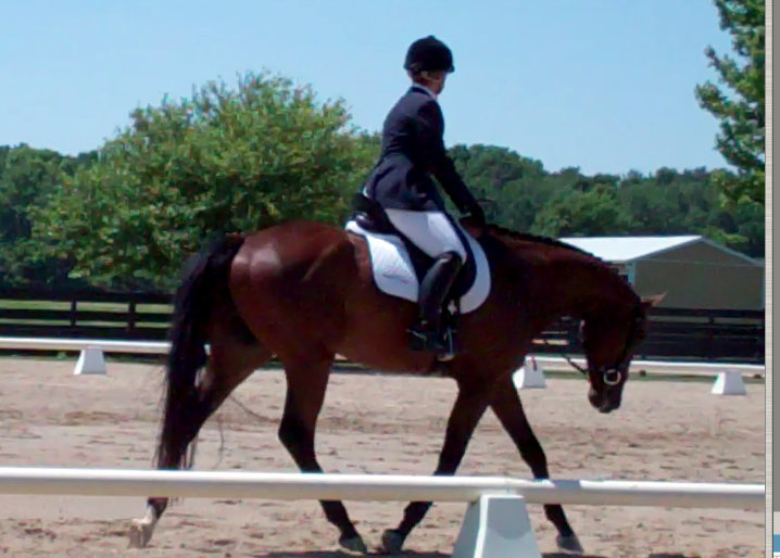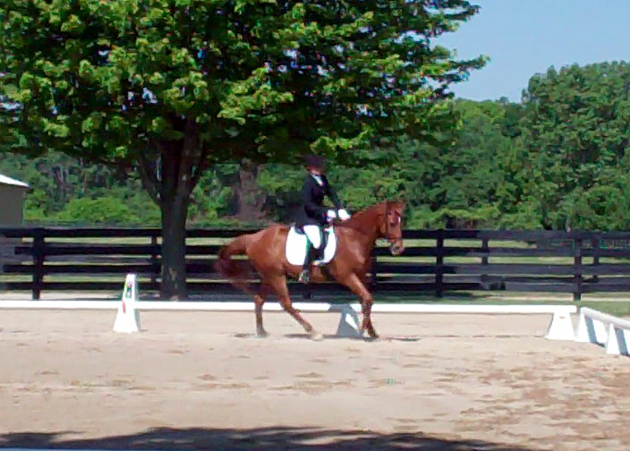 Our friend Kelly also had her green bean, a 5 year old OTTB she’s nicknamed Bubba, out for his first dressage show at Training. He’s done a couple baby combined tests, and is showing a lot of promise. However, he had some greenie moments during his test, taking exception to the judges booth and spooking whenever he came near C. Kelly rode with tact and empathy, staying quiet but insisting upon forward. As much as I loved watching Liam and Linus, Bubba’s test was inspiring for me. Kelly did a wonderful job of keeping the horse on the aids, and had some very nice moments, including the pretty stretchy trot pictured to the left.